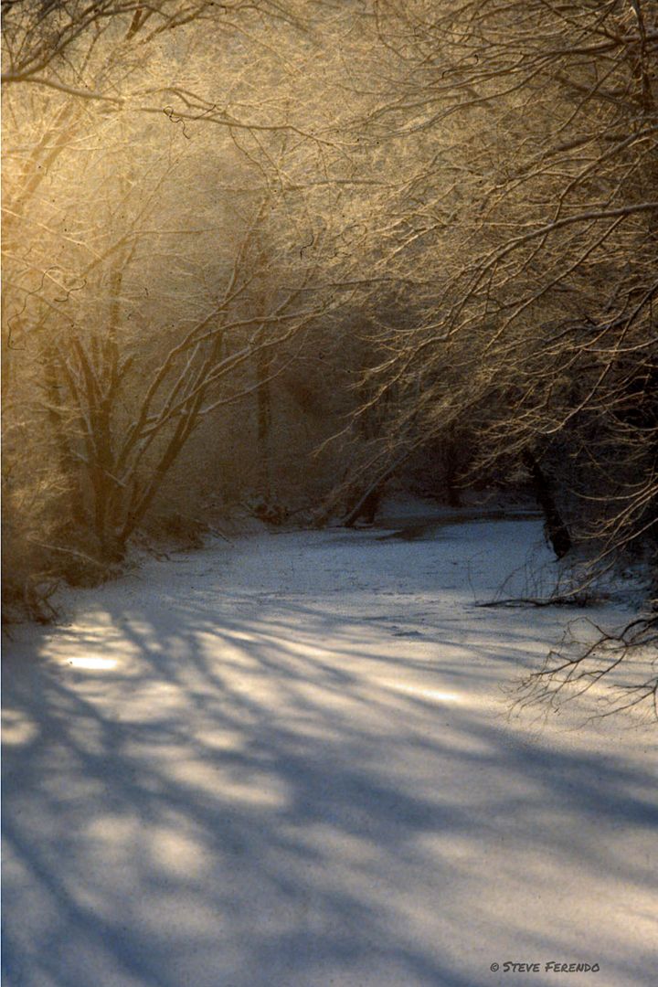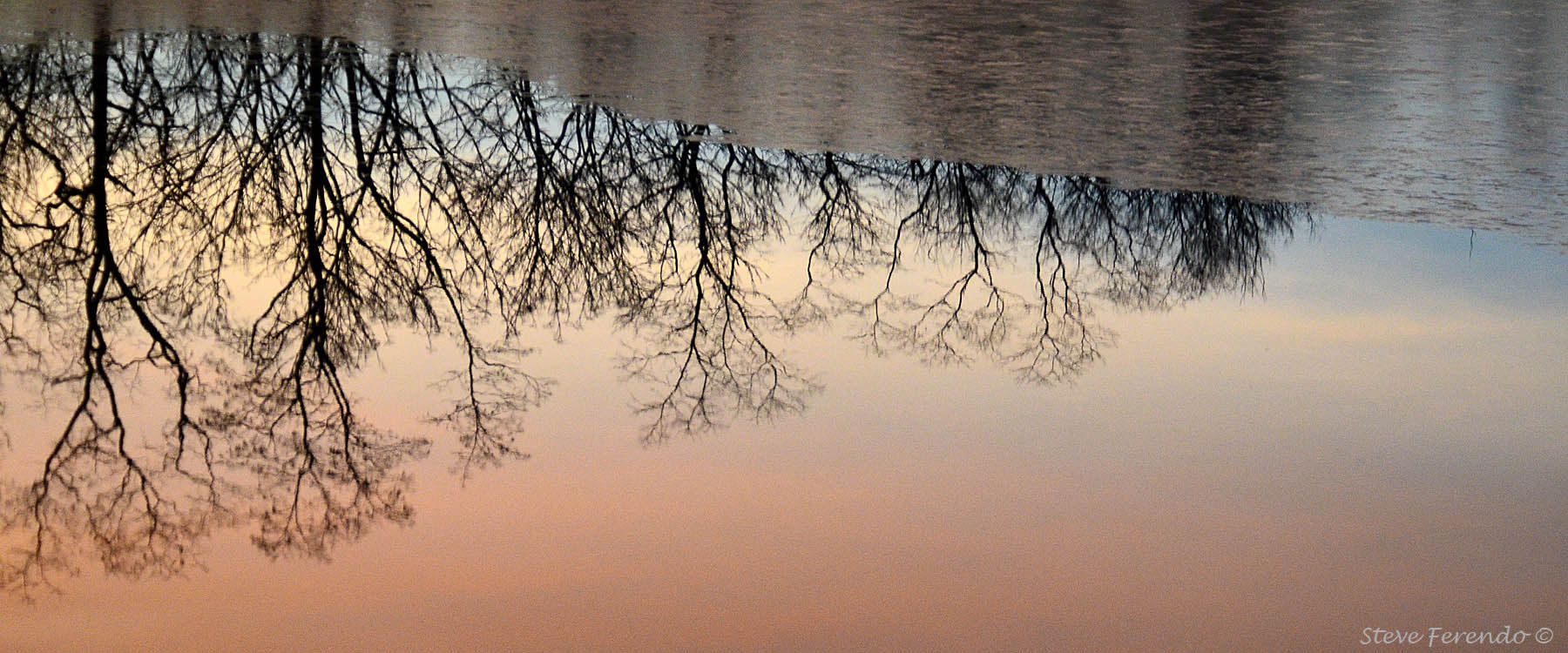 Trees are reflected in an icy pond...